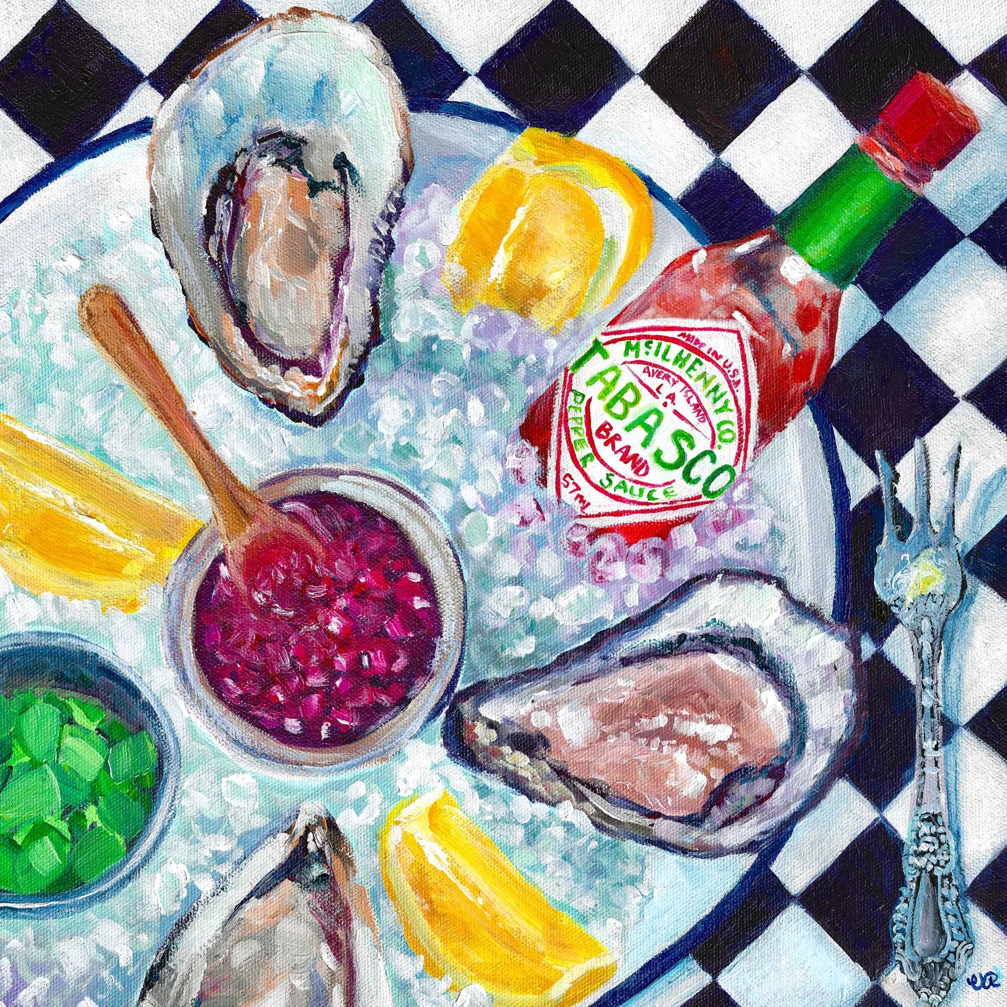 Still Life with Raw Oysters and Tabasco12x12 inchesAcrylic on unstretched canvasVanessa Roettger 2023SoldBuy Print 🛒